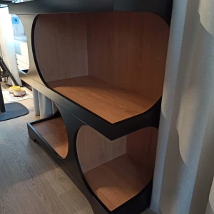 Задняя стенка, полки и перегородки стеллажей из плиты ламинированной толщиной 16 мм., кромка ПВХ толщиной 0,4 мм. Боковые стенки и фасад фигурной формы выполнены из МДФ толщиной 16 мм. и окрашены полиуретановой эмалью.