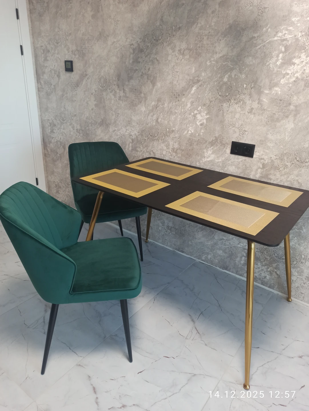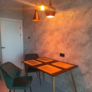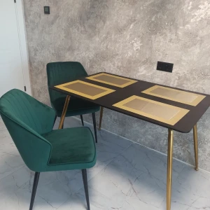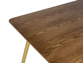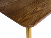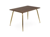 Вместительный и широкий стол Dino подойдет для любого случая. Будь то обыденный завтрак с семьей перед поездкой на работу или романтический ужин со своей второй половинкой, когда на столе стоят не только блюда, но и ваза с красивым букетом роз, зажженные свечи. А может быть вы решите пригласить друзей в гости на уютные посиделки за какой-нибудь интересной настольной игрой. Стол спокойно вмещает 4-6 человек. Тонкая столешница и ножки придают легкость помещению. Вы забудете об ощущении тесноты и захламленности. Наоборот — придет приятное чувство, будто стало легче дышать. Столешница из МДФ покрыта 2-мя вариантами шпона: ореха или черного дуба. Стол обработан специальным материалом — меламином. Он обладает высокой устойчивостью к царапинам, сколам и вмятинам. Каркас и ножки стола изготовлены из металла и покрашены в матовый золотистый цвет, что добавит капельку солнца в вашу комнату.