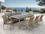 Цвет - Светло-коричневый. Материал - Двойной полуКруглый искусственный ротанг. Посадочных мест 8. Каркас - Сталь. Столешница - Закаленное стекло (3 шт.). Диван W190xD76xH68см. подушки в комплекте. Стол L190хW90xH74 см. Стул W42xD59xH92 см. (5 шт.) подушки в комплекте.