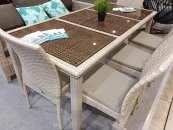 Комплект плетеной мебели T365/Y380C-W85 Latte (8+1). В составе комплекта: стол и 8 стульев без подлокотников с подушками. Высококачественная лоза из полиротанга цвета латте стойкая к любым атмосферным явлениям. Крепкий стальной каркас с полимерным антивандальным покрытием и отличным качеством сварки. Изделие сплетено вручную нашими мастерами под жестким контролем качества на каждом этапе производства. Лоза максимально приближена по рельефу и текстуре к естественному материалу. Идеально подходит для использования на улице и внутри помещения в любую погоду. Не боится воды, солнца и минусовой температуры. Подушки входят в коплект на диван и стулья. Цвет - Латте (серо-белый). Стoл: L190хW90xH74 см. Стекло: закаленное- 6мм, стекло сверху, цвет - бронза. Стул: W42xD59xH92 см. (8 шт.). Каркас: труба сталь D25. Материал: искусственный ротанг. Цвет: Latte, подушки в комплекте.
