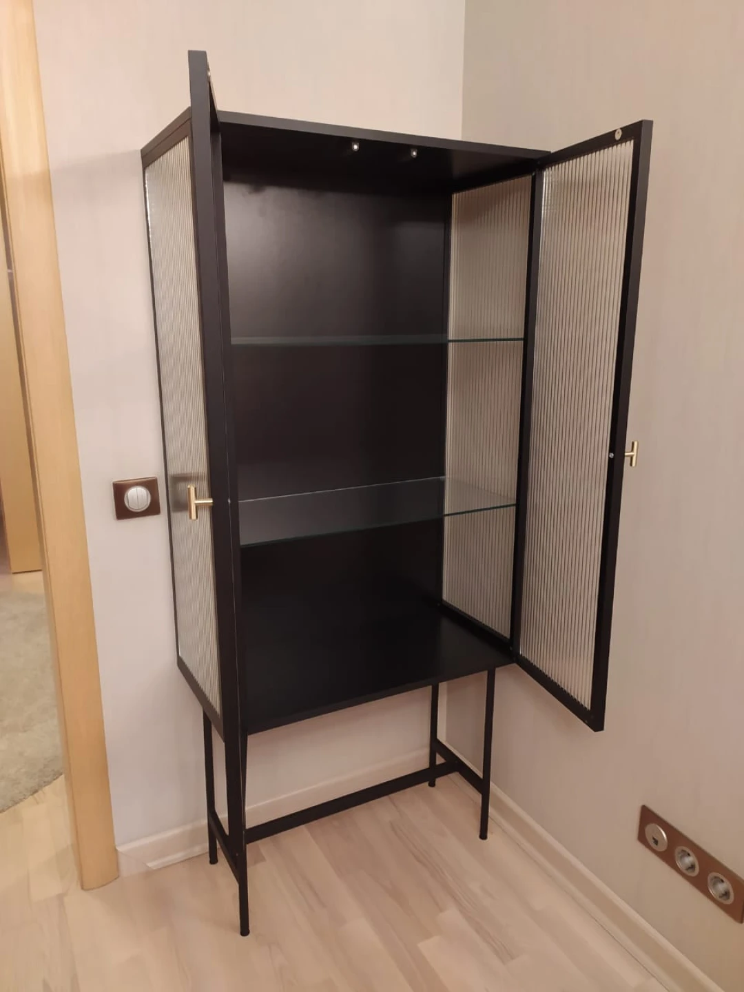 Основание из стальной трубы черного матового цвета с регулируемыми подпятниками. Опоры – регулируемые. Предусмотрено крепление к стене (крепежи в комплекте).