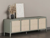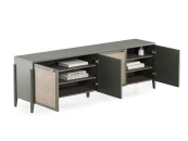 Тумба под телевизор с ротангом tioTeo Vishera серого цвета RAL 7023 Наружный корпус и фасады – МДФ, матовая итальянская эмаль Внутренний корпус – ЛДСП Egger Ножки - массив бука Фурнитура с доводчиками Ручка – алюминий, отделка золото глянец, производство Европа