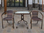 Стол: L60x60WxH70 см. Стекло: закаленное- 5 мм. Труба: сталь D25 с полимерным покрытием. Столешница по периметру искусственный ротанг. Стул: W54хD58xH74 см. Каркас: труба сталь D25.Материал: искусственный ротанг. Цвет: Cappucino Объем и вес комплекта: 0,32м3,13,8кг.