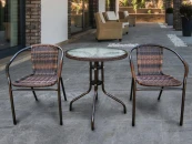 Стол: D60xH70 см. Стекло: закаленное- 5 мм. Труба: сталь D25 с полимерным покрытием. Столешница по периметру искусственный ротанг. Стул: W54хD58xH74 см. Каркас: труба сталь D25.Материал: искусственный ротанг. Цвет:орех(В) Объем и вес комплекта: 0,32м3,13,8кг.