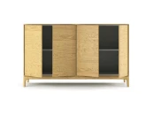 Материалы, покрытие и фурнитура: Ножки и каркас - массив дуба Внешний корпус и фасады - МДФ, натуральный шпон дуба Покрытие - тонировка, матовый лак Внутренний корпус и ящики - ЛДСП, серый Петли - push to open (4 фасада)