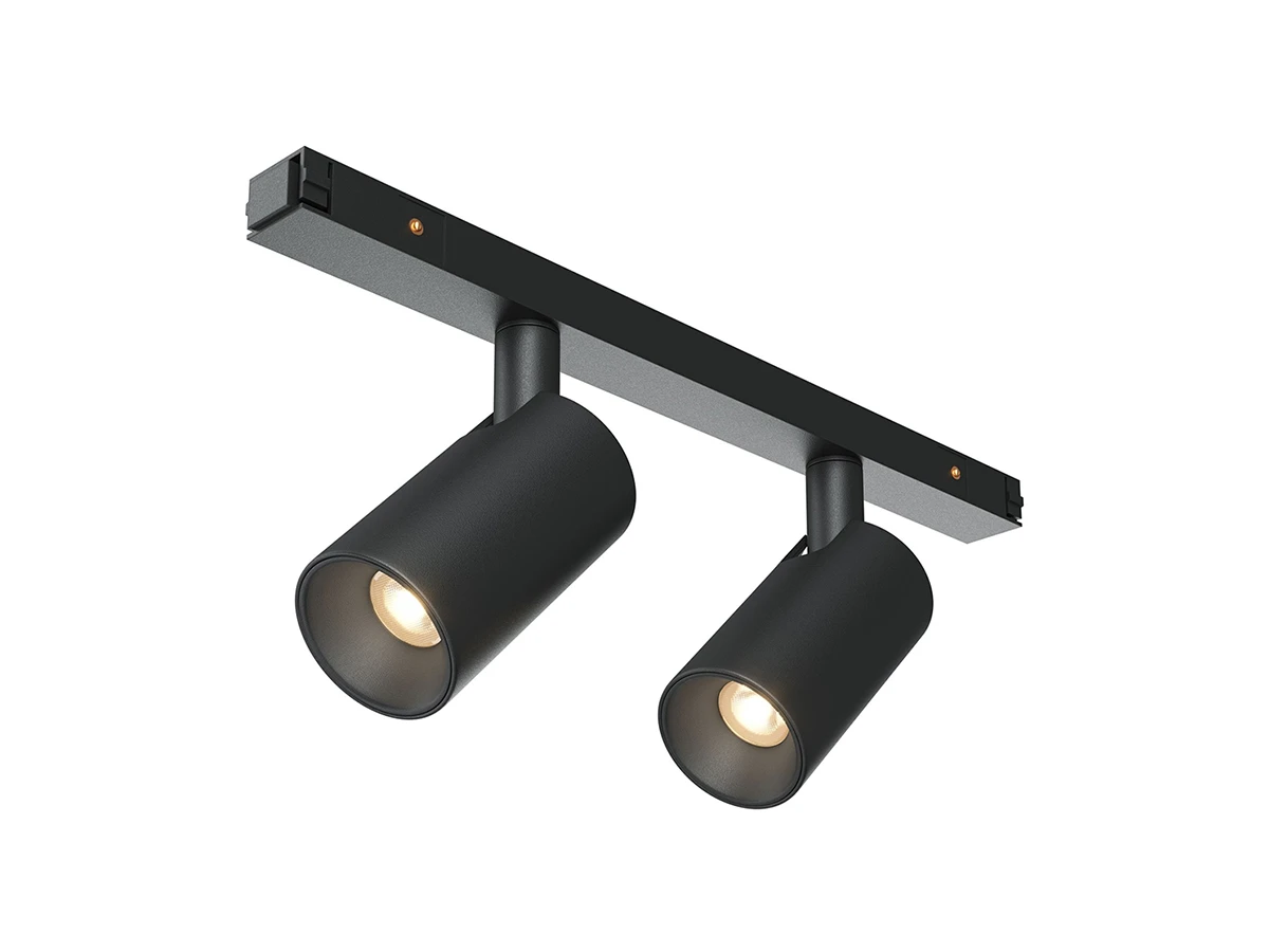 Черная арматура с глянцевой поверхностью выполнена из алюминия. Плафоны могут вращаться независимо друг от друга, обеспечивая точечное освещение зон. Две модели — в спотовом или подвесном исполнении. LED-источники поддерживают переменную цветовую температуру в диапазоне от 3000К до 6000К. При использовании стандартных блоков питания без функции управления, светильники при установке в трек одной стороной имеют цветовую температуру 3000K, а при установке другой стороной – 6000К. Светильники поддерживают функцию группового диммирования и регулировки цветовой температуры при использовании блоков питания по протоколам Bluetooth Mesh или DALI.