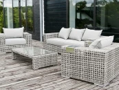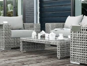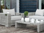 Корпус мебели изготовлен из прочного алюминия и оплетен вручную плоским искусственным ротангом. Цвет серый.Подлокотники плетеного дивана и кресел оснащены алюминиевыми подставками, на которые можно поставить бокал или тарелку.
