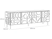 Тумба с четырьмя распашными дверями, расположенными в ряд. За каждой дверью отделение со съёмной полкой. Перестановка полок по высоте не предусмотрена.