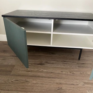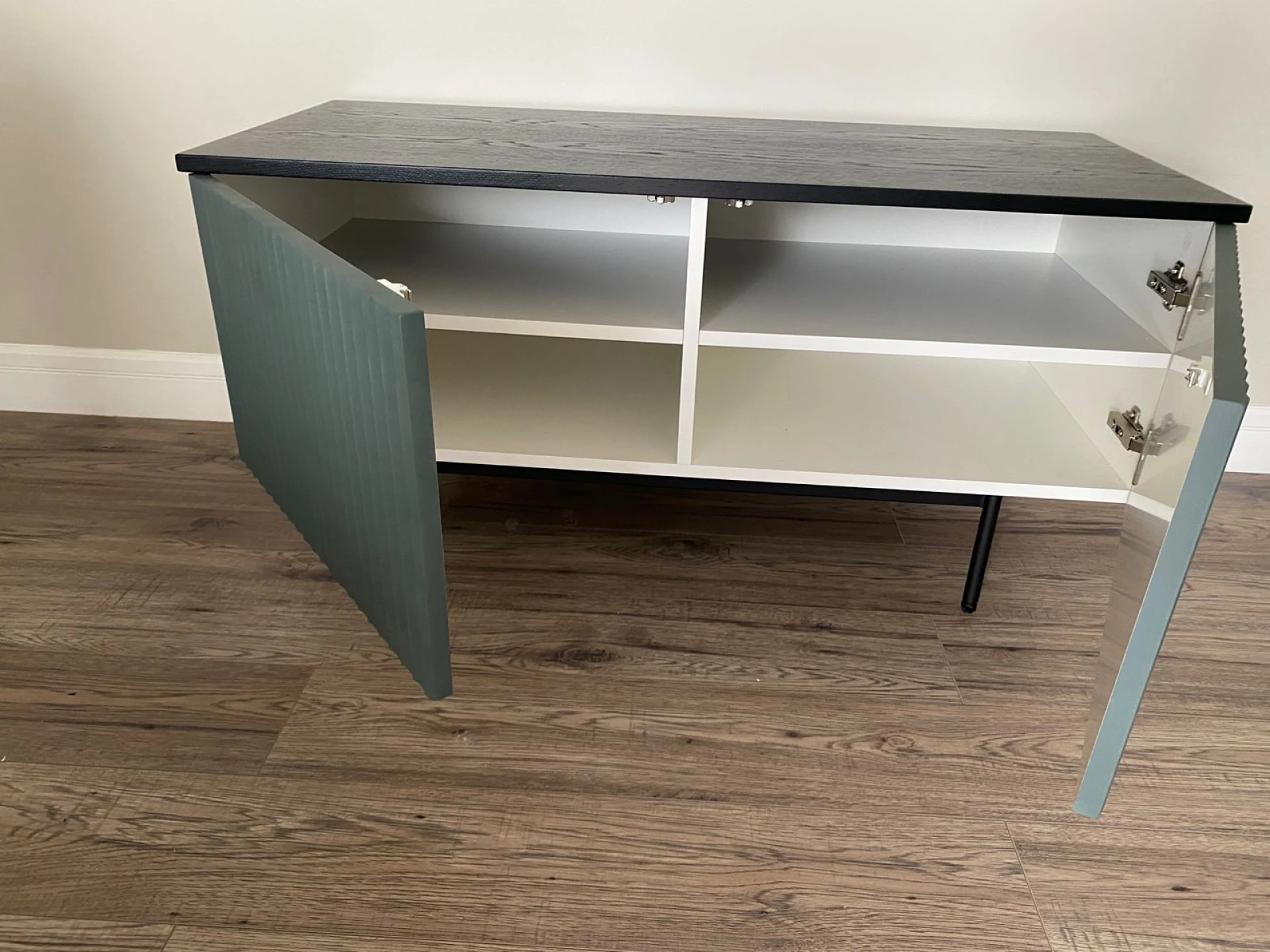 Тумба Mikko разделена вертикальной перегородкой на два отделения, которые закрываются распашными дверями. В каждом отделении по одной съёмной полке, перестановка полки по высоте не предусмотрена.