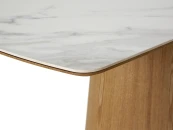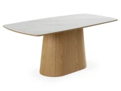 Обеденный стол с лаконичным характером для актуальных интерьеров. Трапециевидное внушительное основание поддерживает прямоугольную столешницу из белой матовой керамики на основе МДФ с отделкой натуральным шпоном дуба. Который отличается прочностью, долговечностью и привлекательной текстурой.