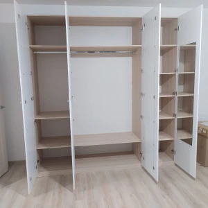 Шкаф четырехдверный состоит их трёх отделений.|В центральном отделении расположены две полки и штанга для одежды.|В правом отделении - 5 полок. В левом - 3 полки и штанга для одежды.|На одной дверце шкафа с внутренней стороны расположено зеркало.|Шкаф установлен на регулируемые опоры.|Данную мебель рекомендуется крепить к стене.|Ручки продаются отдельно, не входят в стоимость изделия.