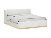 Кровать оснащена металлическим подъемным основанием с гибкими ламелями, под которым находится внутреннее отделение, предназначенное для хранения белья или других предметов. Спинка и царги кровати выполнены из плиты ЛДСтП т.22мм, брусков и березовой фанеры. Настилы из пенополиуретана и синтепона. Подиум сделан из плиты МДФ и брусков. Нижнюю часть подиума украшает металлическая лента из нержавеющей стали с покрытием «матовое золото». Дно бельевого ящика: плита ЛДСтП т.16мм «Белая Гладкая».