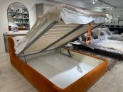 Кровать оснащена металлическим подъемным основанием с гибкими ламелями, под которым находится внутреннее отделение, предназначенное для хранения белья или других предметов. Спинка и царги кровати выполнены из плиты ЛДСтП т.22мм, брусков и березовой фанеры. Настилы из пенополиуретана и синтепона. Подиум сделан из плиты МДФ и брусков. Нижнюю часть подиума украшает металлическая лента из нержавеющей стали с покрытием «матовое золото». Дно бельевого ящика: плита ЛДСтП т.16 мм. «Белая Гладкая».