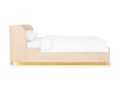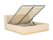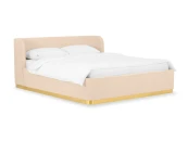 Кровать оснащена металлическим подъемным основанием с гибкими ламелями, под которым находится внутреннее отделение, предназначенное для хранения белья или других предметов. Спинка и царги кровати выполнены из плиты ЛДСтП т.22мм, брусков и березовой фанеры. Настилы из пенополиуретана и синтепона. Подиум сделан из плиты МДФ и брусков. Нижнюю часть подиума украшает металлическая лента из нержавеющей стали с покрытием «матовое золото». Дно бельевого ящика: плита ЛДСтП т.16мм «Белая Гладкая».