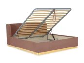 Кровать оснащена металлическим подъемным основанием с гибкими ламелями, под которым находится внутреннее отделение, предназначенное для хранения белья или других предметов. Спинка и царги кровати выполнены из плиты ЛДСтП т.22мм, брусков и березовой фанеры. Настилы из пенополиуретана и синтепона. Подиум сделан из плиты МДФ и брусков. Нижнюю часть подиума украшает металлическая лента из нержавеющей стали с покрытием «матовое золото». Дно бельевого ящика: плита ЛДСтП т.16мм «Белая Гладкая».