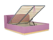 Кровать оснащена металлическим подъемным основанием с гибкими ламелями, под которым находится внутреннее отделение, предназначенное для хранения белья или других предметов. Спинка и царги кровати выполнены из плиты ЛДСтП т.22мм, брусков и березовой фанеры. Настилы из пенополиуретана и синтепона. Подиум сделан из плиты МДФ и брусков. Нижнюю часть подиума украшает металлическая лента из нержавеющей стали с покрытием «матовое золото». Дно бельевого ящика: плита ЛДСтП т.16мм «Белая Гладкая».