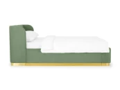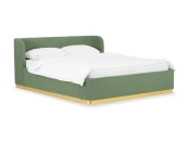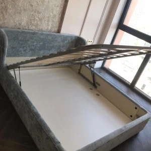 Кровать оснащена металлическим подъемным основанием с гибкими ламелями, под которым находится внутреннее отделение, предназначенное для хранения белья или других предметов. Спинка и царги кровати выполнены из плиты ЛДСтП т.22мм, брусков и березовой фанеры. Настилы из пенополиуретана и синтепона. Подиум сделан из плиты МДФ и брусков. Нижнюю часть подиума украшает металлическая лента из нержавеющей стали с покрытием «матовое золото». Дно бельевого ящика: плита ЛДСтП т.16мм «Белая Гладкая».