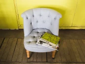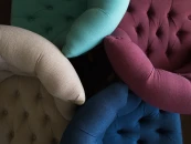 Низкое мягкое кресло на точёных ножках с колёсиками. Спинка и сиденье декорированы пуговицами.