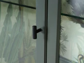 Двери рамочные с филенкой из прозрачного стекла. Двери установлены на скрытые петли с плавным закрыванием. Петли и ручки-кнопки черного цвета.