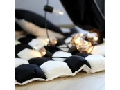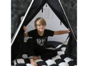 Перед Вами самый тёплый и самый мягкий игровой коврик из нашего каталога. Сделан он по особой технике, одно из названий которой «бомбон». Кажется, что много маленьких шариков сшиты между собой, но на самом деле это один большой пледик! Лаконичная чёрно-белая расцветка позволяет ему отлично смотреться сразу в нескольких вигвамах из нашего каталога, например, в вигваме Black&White. Сидя на таком коврике деткам будет очень тепло и мягко.