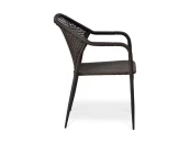 Плетеный стул с подлокотниками из искусственного ротанга коричневого цвета. Стальной каркас. Имеет изящные ножки и необычное и стильное плетение спинки.