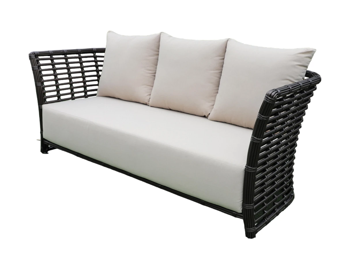 Кресло оснащено каркасом из прочного алюминия, ручное круглое плетение является основным декоративным элементом мебели. Оно выполнено из искусственного ротанга в бронзовом цвете.