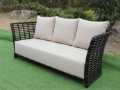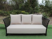 Диван Валенсия подходит для размещения сразу трех персон. Его основа из прочного алюминиевого каркаса. Ручное круглое плетение является основным декоративным элементом мебели. Оно выполнено из искусственного ротанга в бронзовом цвете. В комплекте с трехместным диваном идут мягкие подушки для комфортного расположения. Чехлы съемные бежевого цвета из высококлассного полиэстера с плотностью 300гр/м2. Защитные свойства ткани усиливаются при помощи влагоотталкивающей пропитки. Размер модели – 2020х850х800 мм.