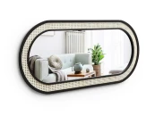 Зеркало настенное в раме. Рамка двойная, пространство между профилями декорировано искусственным ротангом. Все детали окрашены черной эмалью.