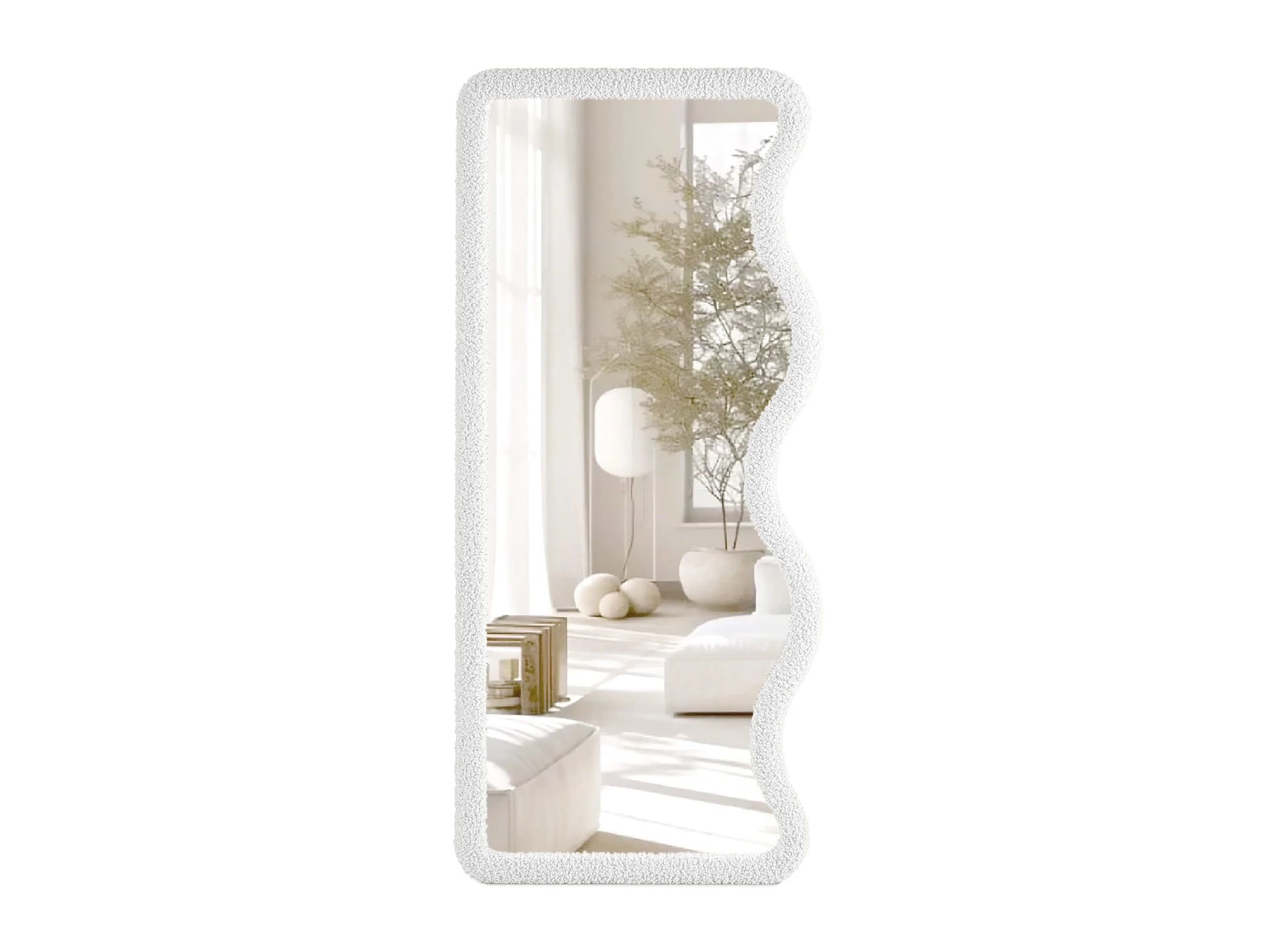 Напольное фигурное зеркало Francis выделяется оригинальной геометрией. Волнистый край контрастирует с прямыми линиями, поддерживает тренд на плавные формы и активную геометрию в интерьере. Рама выполнена из МДФ, обтянута фактурной тканью «букле». Что добавит в ваш интерьер тактильности, глубины, многослойности. Размер зеркального полотна 75x175 см — можно увидеть себя в полный рост.