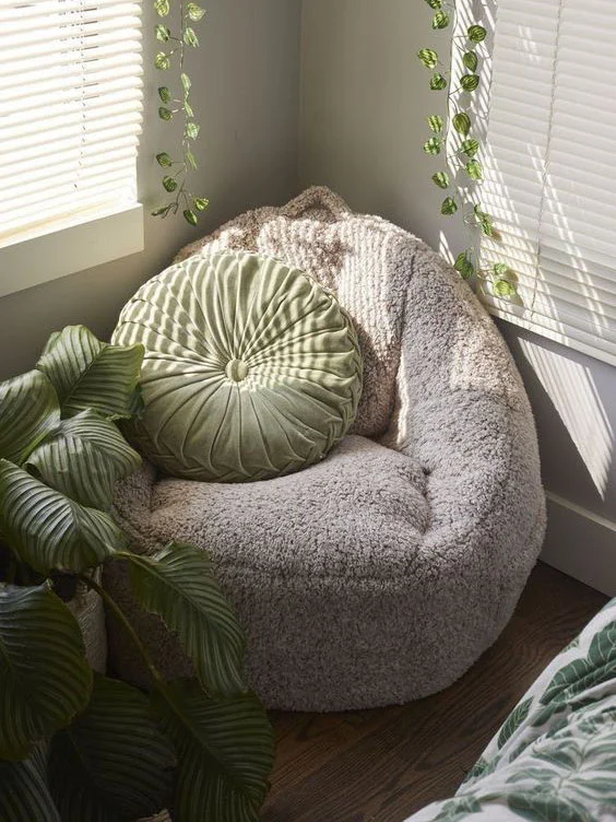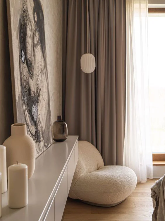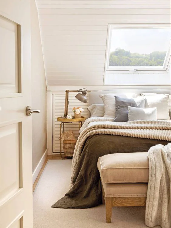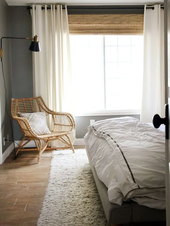 Если в спальне пустует угол или место у стены, то добавьте туда мебель для сидения. Стул или пуфик могут прекрасно дополнить небольшое пустующее пространство. Мягкое кресло визуально согреет спальную комнату и придаст ощущения уюта и комфорта. А если место в спальне позволяет, то два кресла, расположенных напротив друг друга, и небольшой журнальный столик, атмосферно и красиво составят вам компанию за утренней чашкой чая. Скамейка у изножья кровати - ещё один вариант, который может служить местом хранения подушек или пледа.