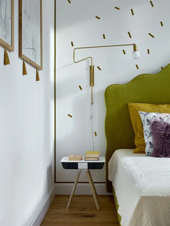 Поменяйте вид прикроватной зоны, а точнее изголовья кровати и прикроватной тумбочки. Если дополнительным источником света в комнате является настольная лампа на прикроватном столике, то замените её на настенную бра. Особенно этот вариант будет актуальным и практичным решением, если место на прикроватной тумбочке достаточно мало и хочется увеличить рабочую поверхность. Настенные бра также придадут объëма и динамики стенам, а бра с поворотными элементами позволят управлять светом, направляя в нужную сторону.