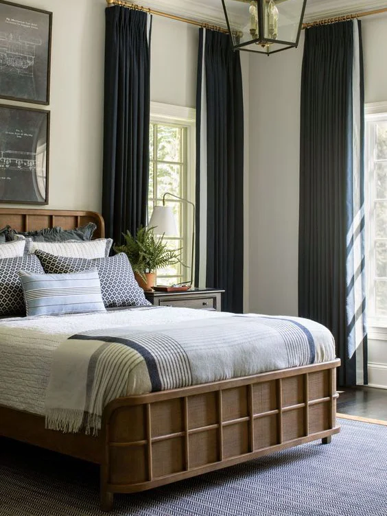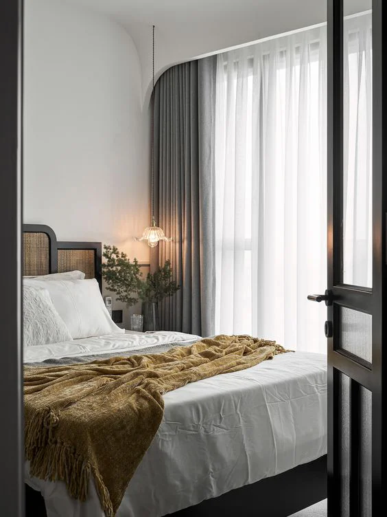 Одним из быстрых способов обновить пространство является смена или добавление текстиля. Рассмотрите для обновления спальни различное сочетание штор и ее драпировки. Легкая и прозрачная ткань придаст интерьеру воздушности и вдохнет воздуха в пространство, минимально перекрывая окна. Более грубая и плотная ткань создаст ощущение кокона и безопасности. Попробуйте поменять место установки штор. Например, шторы на карнизах, установленные под самым потолком, визуально сделают комнату выше. Драпируйте шторы, придавая объем и рельеф ткани, это привлекает и создает большой интерес к зоне окна.