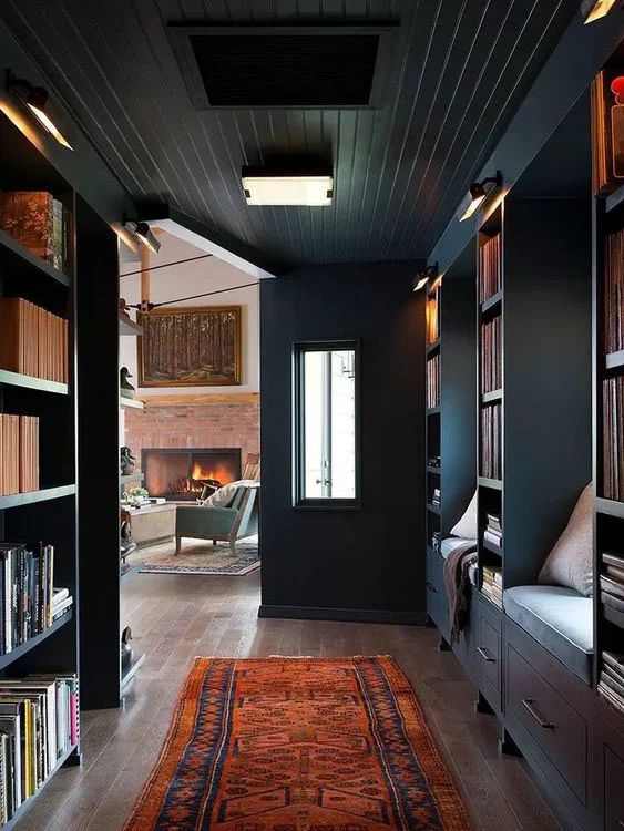 Включите его во всё пространство стен. Рассмотрите, например, глубокие синие и изумрудные оттенки. Они придают особый шарм и глубину узким пространствам, визуально расширяя его. Контраст с белым потолком, создаст ощущение сдержанности, а деревянный пол наоборот смягчит всю композицию. Для придания дерзкости интерьеру возьмите за основу чёрный оттенок, а для напольного покрытия используйте насыщенную темно-синию или зелёную палитру.