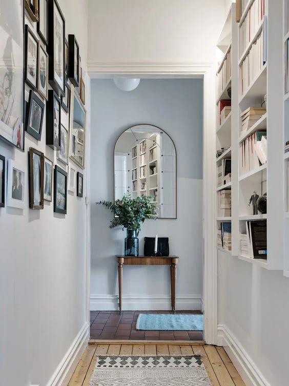 Создать в своём доме художественную картинную галерею - один из лучших вариантов красиво и эстетично украсить свой дом. Если ваша прихожая имеет длинную квадратуру, то воспользуйтесь этим преимуществом и создайте целый ряд из рамок с семейными фотографиями или картин художников. Расположите в хаотичном порядке, или придерживайтесь более строгих линий.
