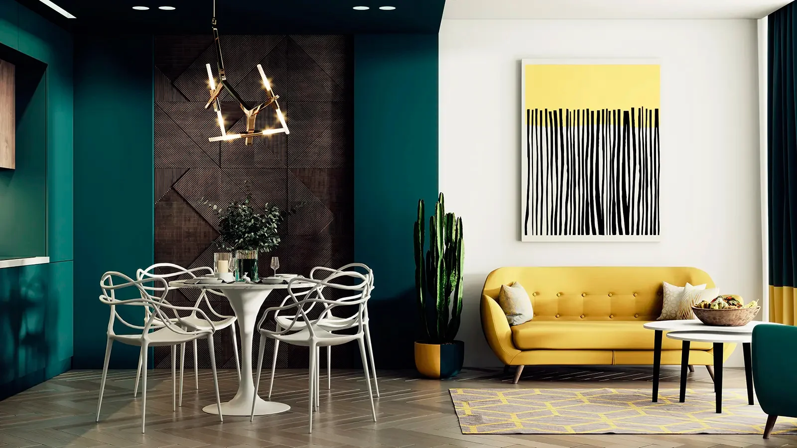 Стекло — еще один модный материал, обычно присутствующий в столовой. Он гладкий и обычно не смещает фокус внимания на себя. Но самая трендовая мебель уходит от простой деревянной или хромированно-стеклянной мебели, которую мы привыкли видеть. Например, сейчас популярны столы на металлическом каркасе — матовом черном или золотом. А для столешницы выбирается искусственный камень, слэб дерева или мрамор. И даже в бюджетных аналогах с МДФ есть имитации мрамора, гранита или какого-либо металла.