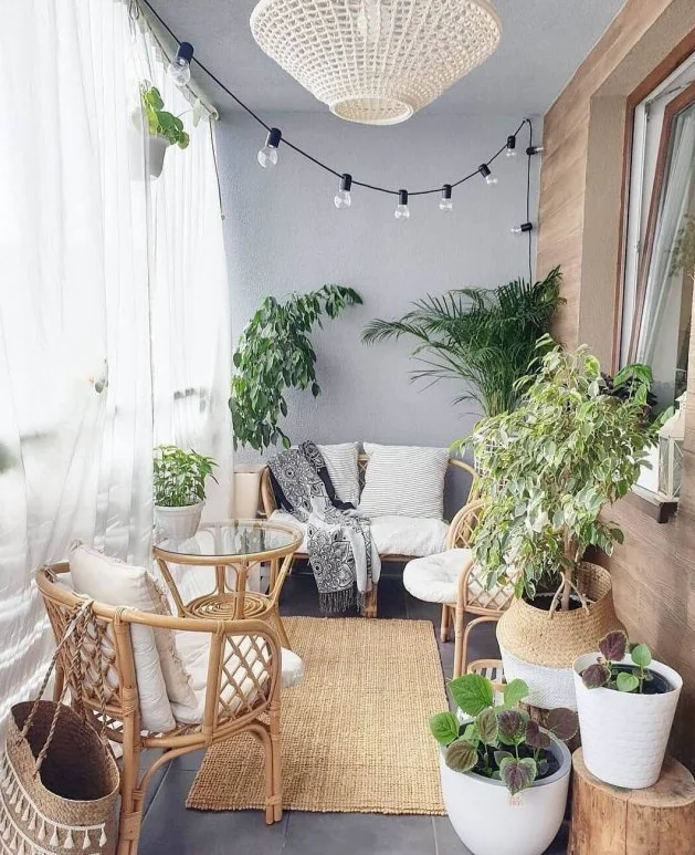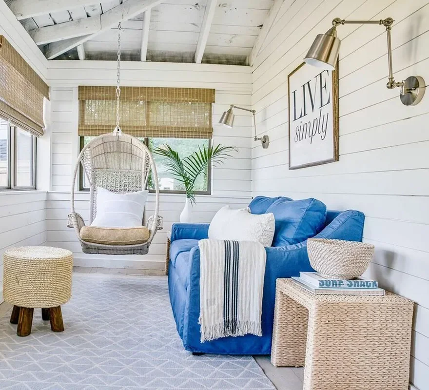 Пространство на веранде — отличная возможность проявить креатив. Добавьте колоритности и индивидуальности, используя акцентный декор. Украсьте стены и открытые поверхности, чтобы помещение радовало взгляд. Составьте композиции из цветов и зелени, развесьте фото, картины или настенные панно, используйте ретро предметы и природные материалы. Например, коллекция соломенных шляп может стать идеальным штрихом к лаунжевой веранде в эстетике коастал. А пара необычных подсвечников придаст особое очарование вашей любимой летней локации.