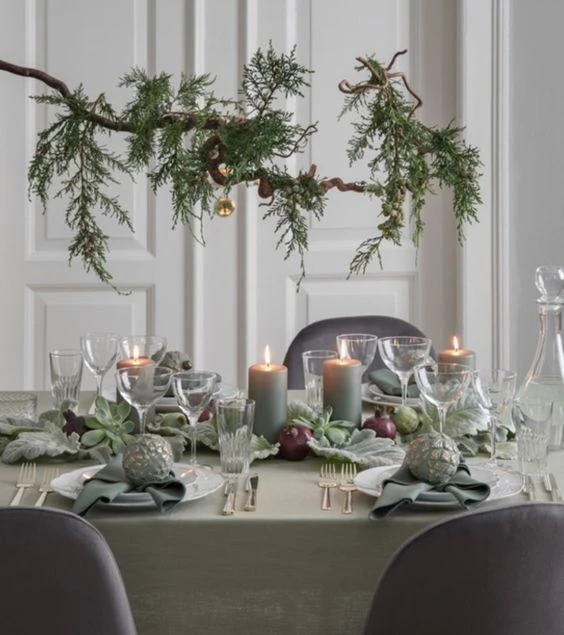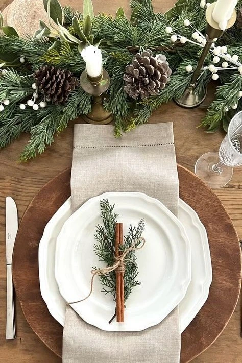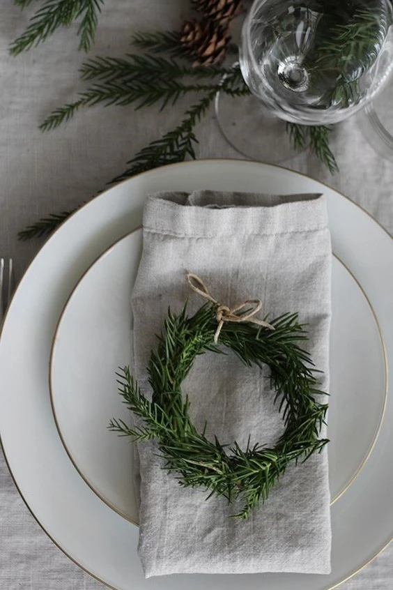 Чудесно, одновременно торжественно и спокойно, смотрится хвоя на новогоднем столе. Хвойной композиций можно обозначить центр, разместив в ней свечи, декоративные фигурки, светильники. Или декорировать индивидуальные места, украсив пушистыми веточками салфетки, тарелки, бокалы. Для сервировки подойдет нобилис, который отличается сине-зеленым оттенком, ароматная туя, можжевельник. Лайфхак: для элегантной сервировки возьмите однотонную салфетку и декоративную ленту, сквозь которую пропустите веточку хвои. А для более расслабленного настроения можно украсить сервировочную тарелку дуэтом зеленого «росточка» с палочкой корицы.