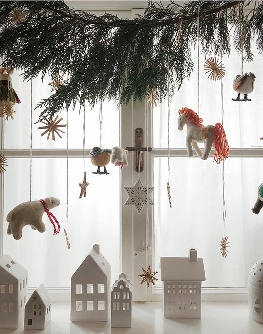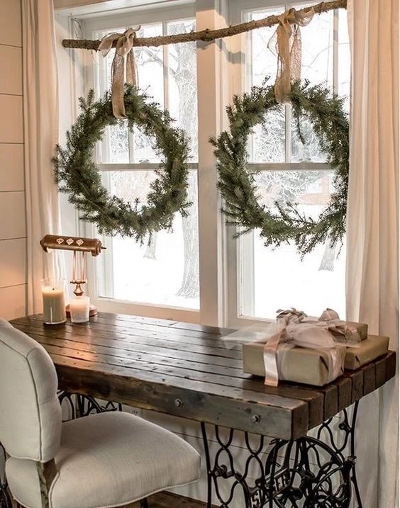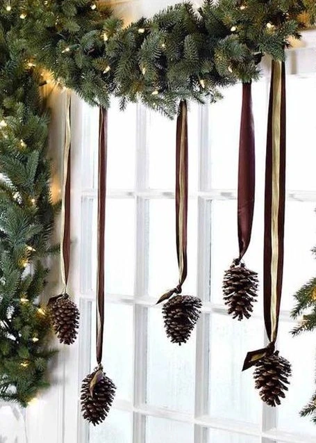 Воздушно и атмосферно выглядит хвоя на окнах. Из неё можно создавать удивительные шедевры и сказочные миры, которые наполнят дом неповторимым духом Нового года и Рождества. Закрепляйте хвойные подвесы сверху, раскладывайте зеленые гирлянды на подоконниках, развешивайте венки и «снопики». Можно наклеить хвойные веточки на стекло или «перемешать» их с искусственным снегом, ледяным узором, сверкающими гирляндами, переливающейся бахромой и елочным дождиком. «Лесные» занавески смотрят красиво как снаружи, так и внутри!