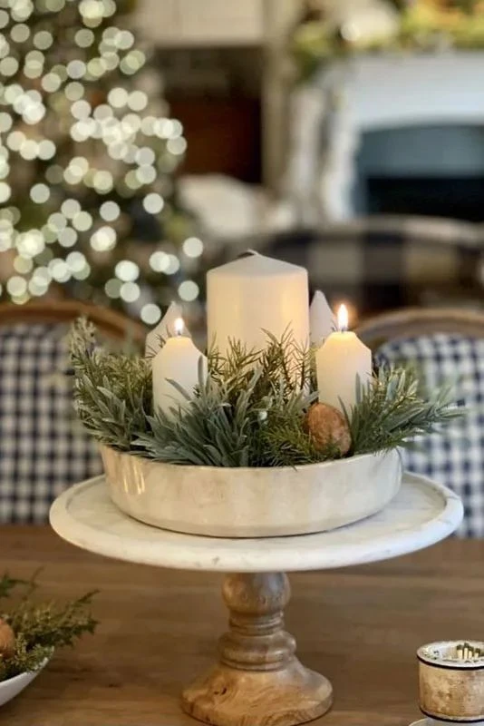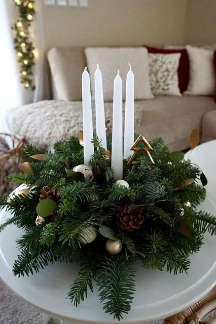 Пожалуй, самое теплое и праздничное сочетание — свечи и хвойная зелень. Такое украшение станет как новогодним декором интерьера, так и приятным подарком. В качестве основы можно использовать древесные спилы, подносы, тортовницы, блюда, чаши, салатники, бокалы, кружки. Емкости заполняют флористическим оазисом (в нём легко сделать углубление для свечей), песком, корой, мелкой галькой, камешками, мхом, кокосовым волокном или бусинами из стекла. Соберите композицию из веточек ели, пихты, сосны и свечей. Делайте акцент на контрастных сочетаниях: гладкие почти глянцевые свечи и колючие иголочки, темный и белый цвет, вытянутые удлиненные свечи и небольшие закругленные лапки. Подсвечник также можно разнообразить гирляндами, игрушками, сушеными ягодами, шишками. Ароматизированные свечи усилят запах хвои. Лайфхак: используйте для хвойного подсвечника опавшие или срезанные ветки ёлки. Даже самые маленькие «отрезки» пригодятся для украшения свечей, новогодней сервировки. Закрепите мини-веточку джутовой нитью на белоснежной свече — и декор в экостиле готов!