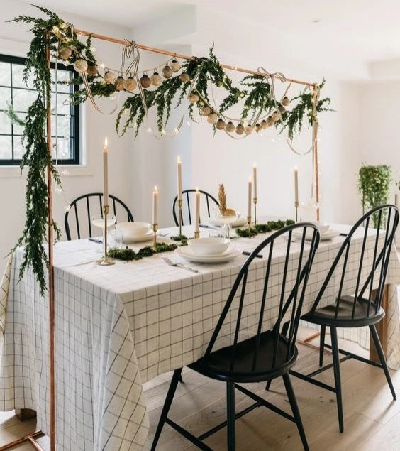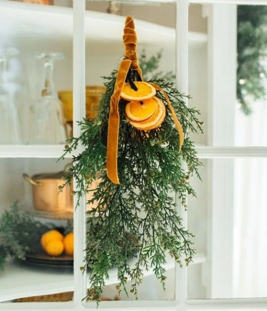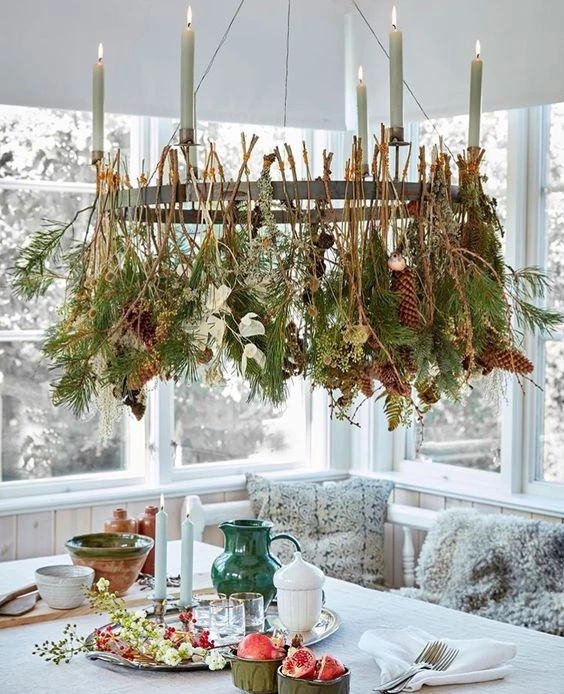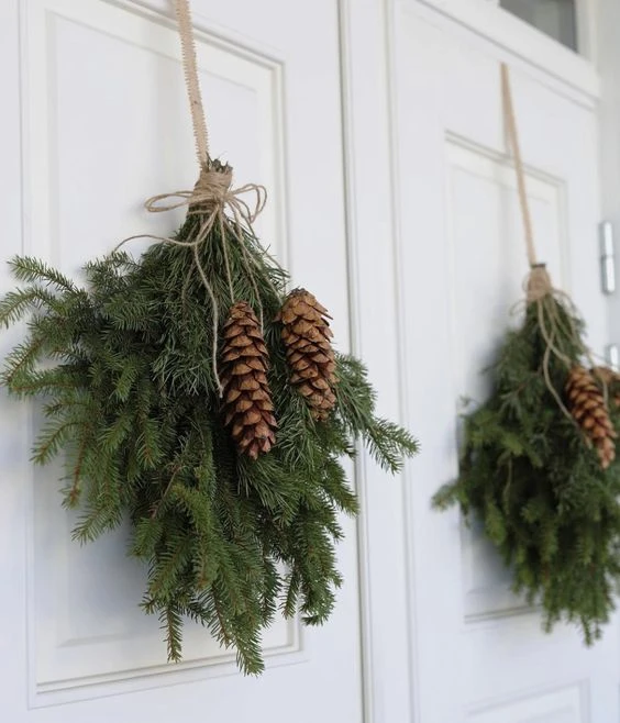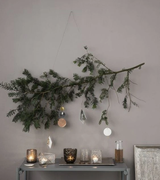 Эффектный и очень простой новогодний декор — хвойные подвесы. Подойдут ветки, которые, возможно, сломались на ёлке или специально были срезаны для симметрии. Подвесы можно закрепить на стене, над дверью, изголовьем кровати, праздничным столом. Можно сфокусировать на них внимание, выделив гирляндами, игрушками, фонариками. Или оставить их первозданный внешний вид для любований дикой красотой.