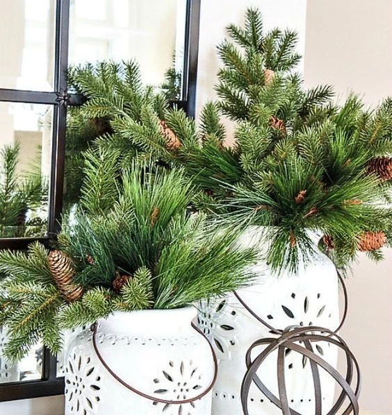 Расставьте «фитонцидовые» букеты по дому — и вместе с праздничным настроем вы ощутите прилив сил, энергии, бодрости, снимете напряжение и усталость, будто прогулялись по сосновому бору. Свежие ветви ели, сосны, пихты, кедра, можжевельника, тиса, кипарисовика сыграют роль натуральных ароматизаторов и помогут создать оригинальный новогодний антураж. Букеты могут быть как компактными и лаконичными, так и крупными, с яркими элементами. Гармонично хвойные смотрятся в массивных вазах из стекла, керамики, металла. Также подойдут для пушистых композиций неординарные ёмкости, напоминающие пеньки, полые стволы деревьев, гнёзда, горшочки и корзинки. Букеты и композиции помещайте в прохладную воду, флористические губки, влажный песок, растворы из глицерина или желатина. Для поддержания свежести рекомендуется опрыскивать холодной водой хотя бы раз в день. Обязательно зачищайте веточки от коры на 3-4 см, так они дольше останутся сочными и упругими. Лайфхак: создайте оригинальную мини-ёлочку, просто собрав охапку веточек в «веник», а затем переверните его и распушите. Такие «деревца» можно посадить в горшочки из мешковины, припорошить искусственным снегом и украсить ими новогодний стол.