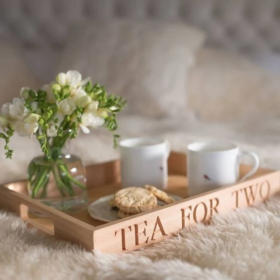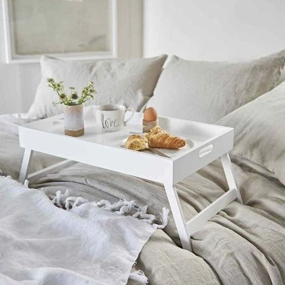 Поднос или складной столик — ещё один аксессуар для приятного провождения времени дома. С его помощью можно организовать гедонистический завтрак в кровати, перекус у экрана, романтический вечер. Подносы из дерева, керамики можно использовать в качестве сервировочных подставок для сыра, орехов, канапе, бутербродов, фруктовых и овощных нарезок. Также с их помощью можно оформить аккуратный уголок на кухне для специй, чая, соусов, кондитерских изделий.
