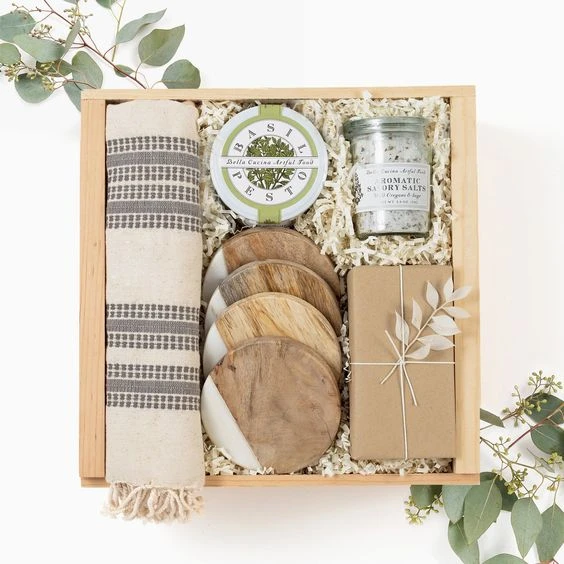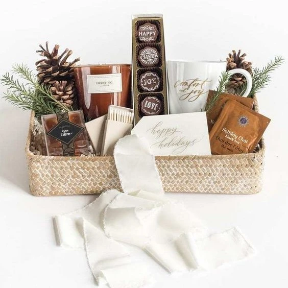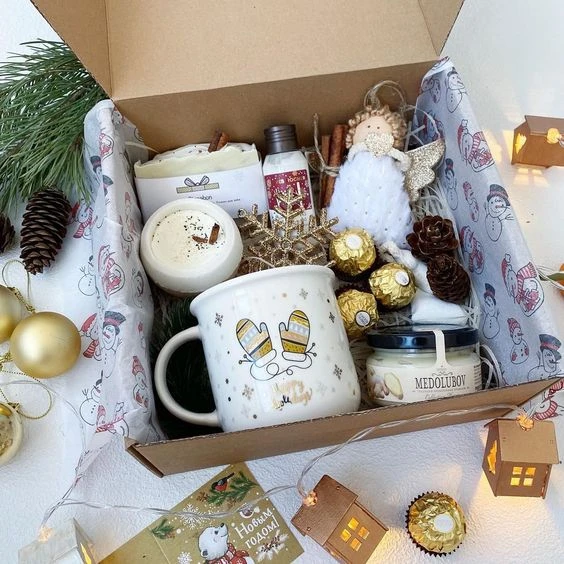 Хюгге-бокс или «коробка счастья» — ёмкость с приятными вещицами в одной стилистике. В качестве бокса можно использовать коробку из картона, дерева, плетеную корзинку. Наполнение может быть любым. Главное, чтобы оно ассоциировалось с уютом, нежностью, заботой, праздничной атмосферой. Это могут быть комплекты косметики с ароматными ингредиентами, наборы для чая, кофе, глинтвейна, посуда, вязаные вещи, текстиль, новогодние игрушки, сладости, интересная канцелярия, украшения, свечи, ассорти из специй, орехов, мёда и другие детали для создания волшебного настроения.