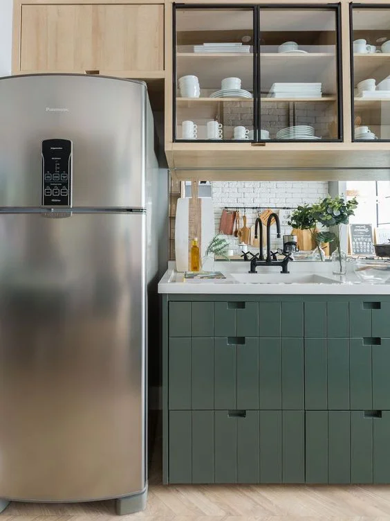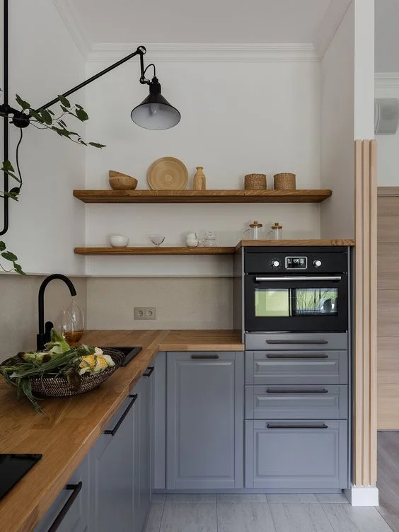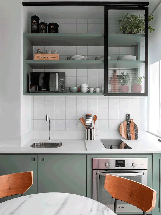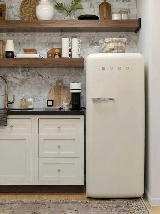 Открытые полки можно использовать для хранения электрической техники: блендеры, тостеры, микроволновые печи и так далее. Если вы воспользовались предыдущим советом и купили небольшой холодильник, всё это у вас получится разместить. Если места мало и техника не помещается, то на этих полках можно хранить посуду и другие вещи.