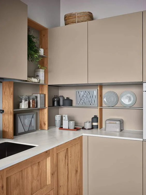 В первую очередь нужно понять, сколько у вас посуды и разных кухонных приспособлений. Если вы поймёте, что у вас не так много вещей, то попробуйте отказаться от верхних ящиков. Открытое хранение на полках визуально разгрузит кухню и в ней будет больше воздуха и пространства. Другой момент – это если у вас много вещей. В таком случае отказываться от верхних шкафов нельзя.