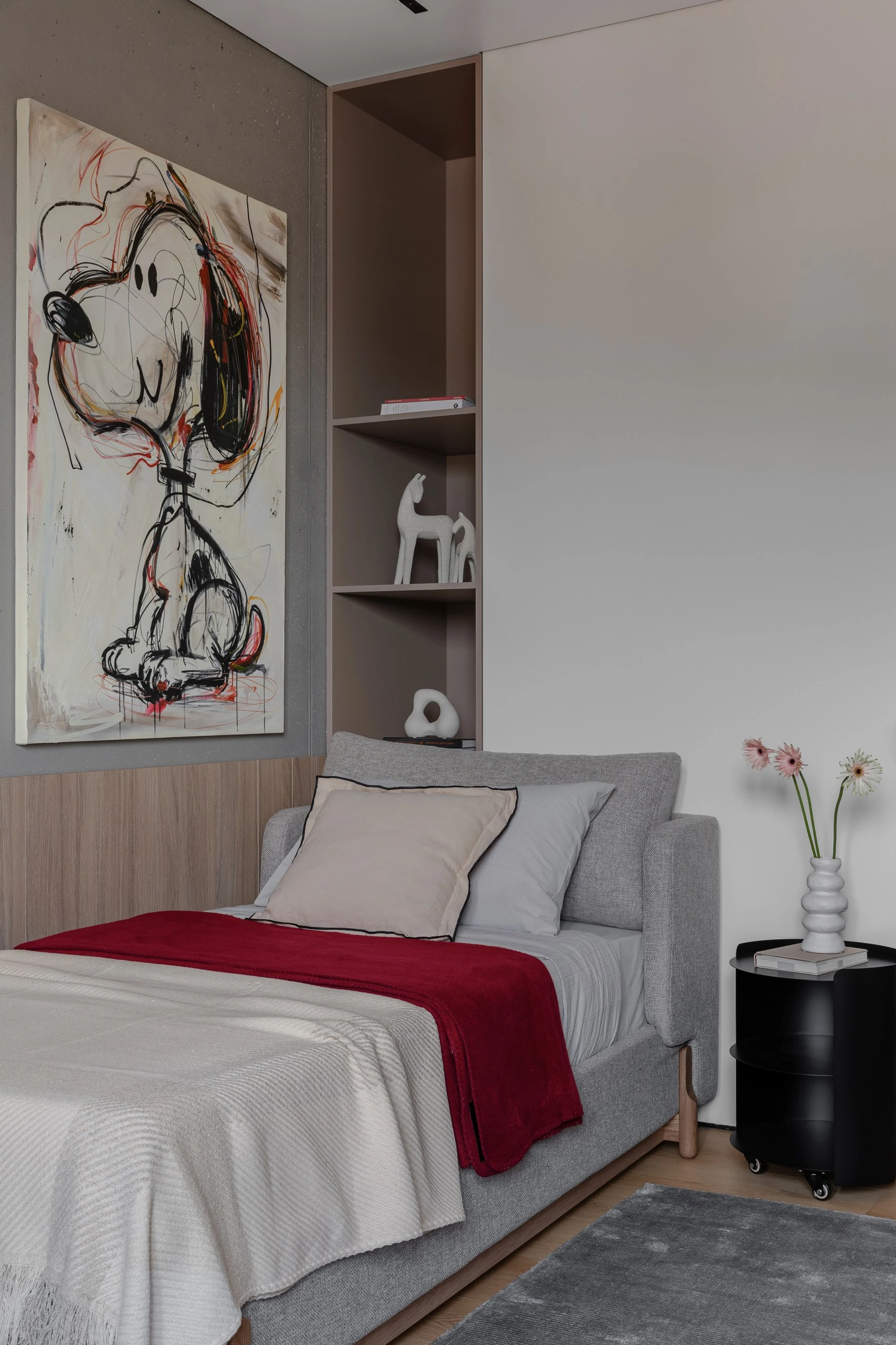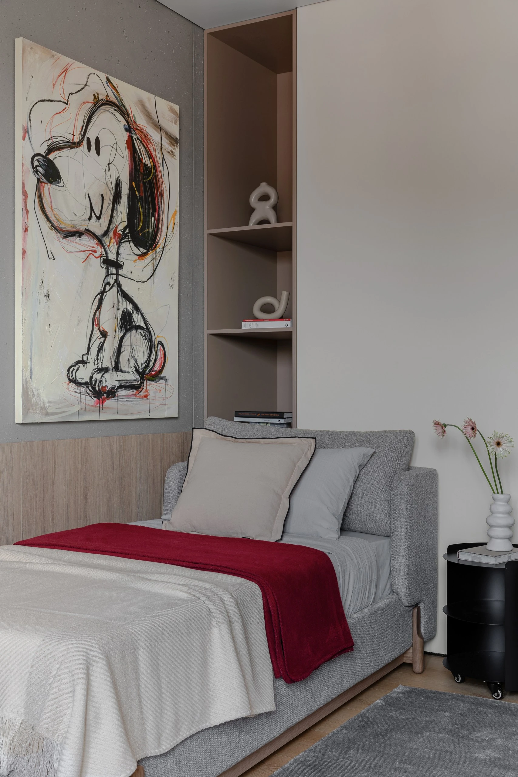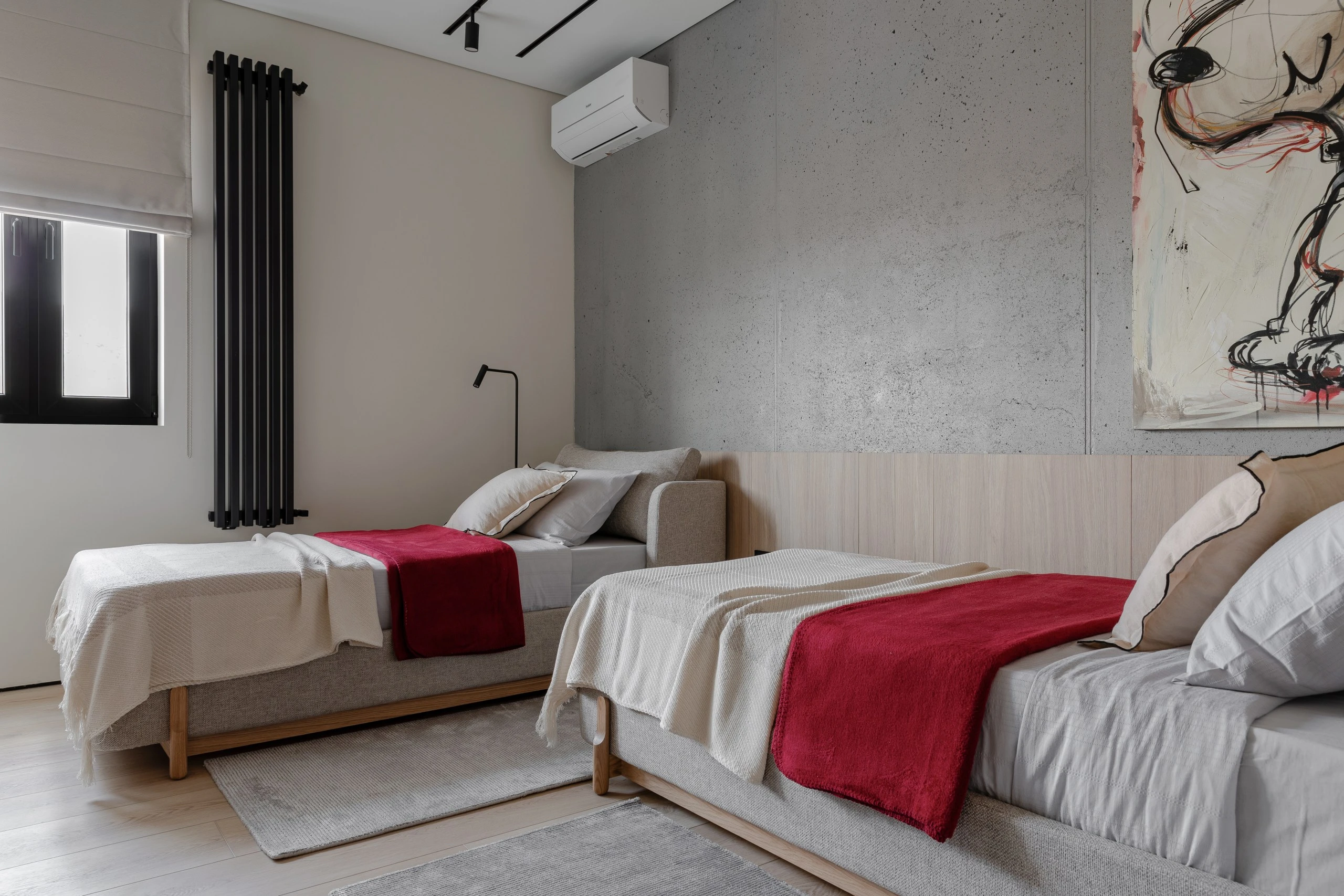 Балансируют «холодность» бетона мягкие детали, элементы из дерева. Фактурный текстиль, гладкие поверхности, тёплый свет, картины смягчают внешний вид бетонной стены, превращают ее в привлекательный акцент интерьера.