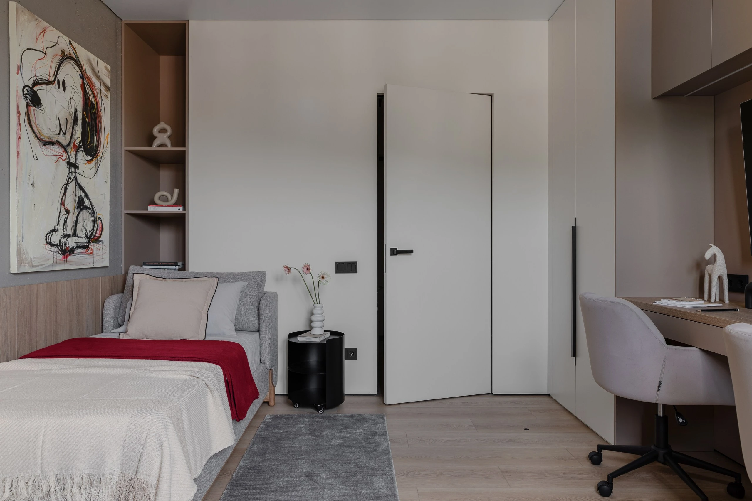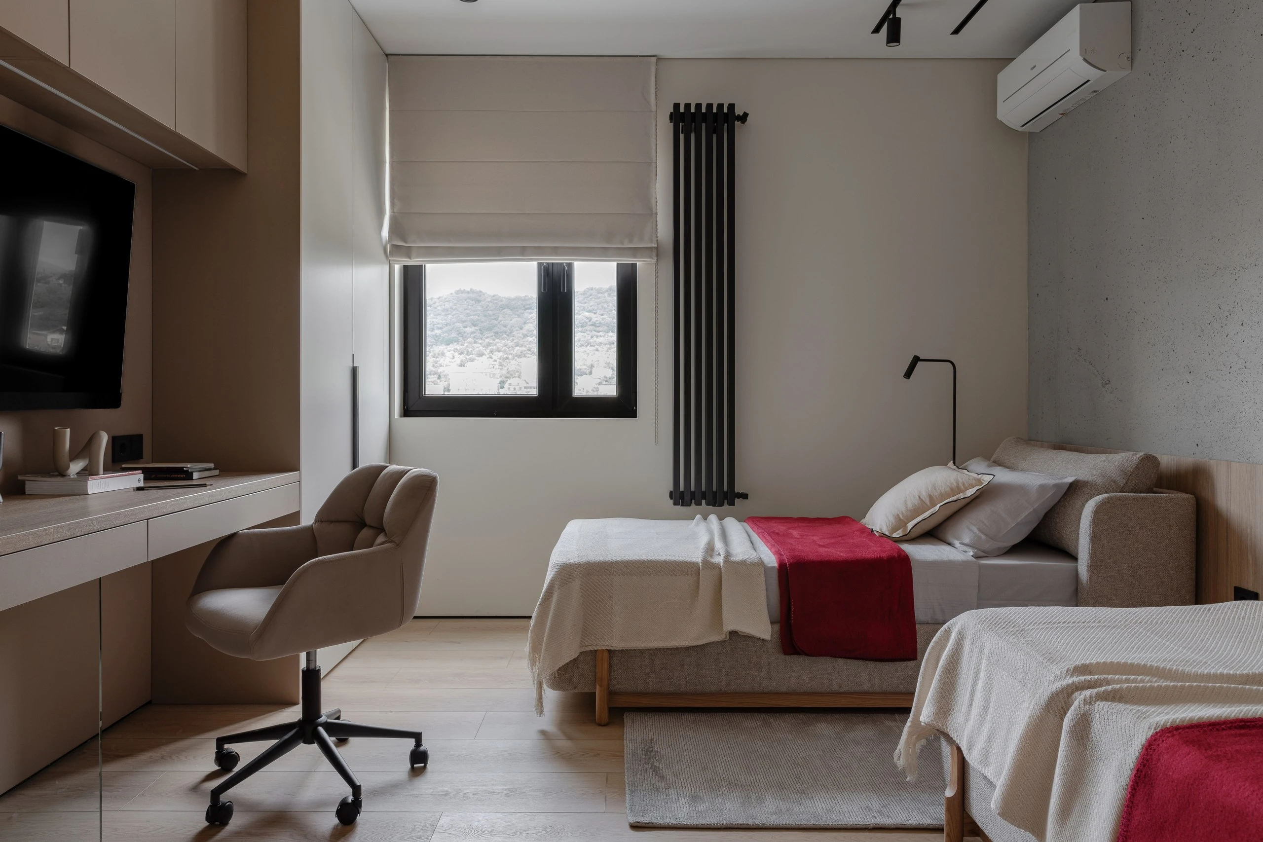 Интерьер спальни и детской отличается продуманностью деталей: кровати с мягкими изголовьями и царгами, рабочие места, системы хранения — всё сосредоточено на комфорте и эстетическом балансе.