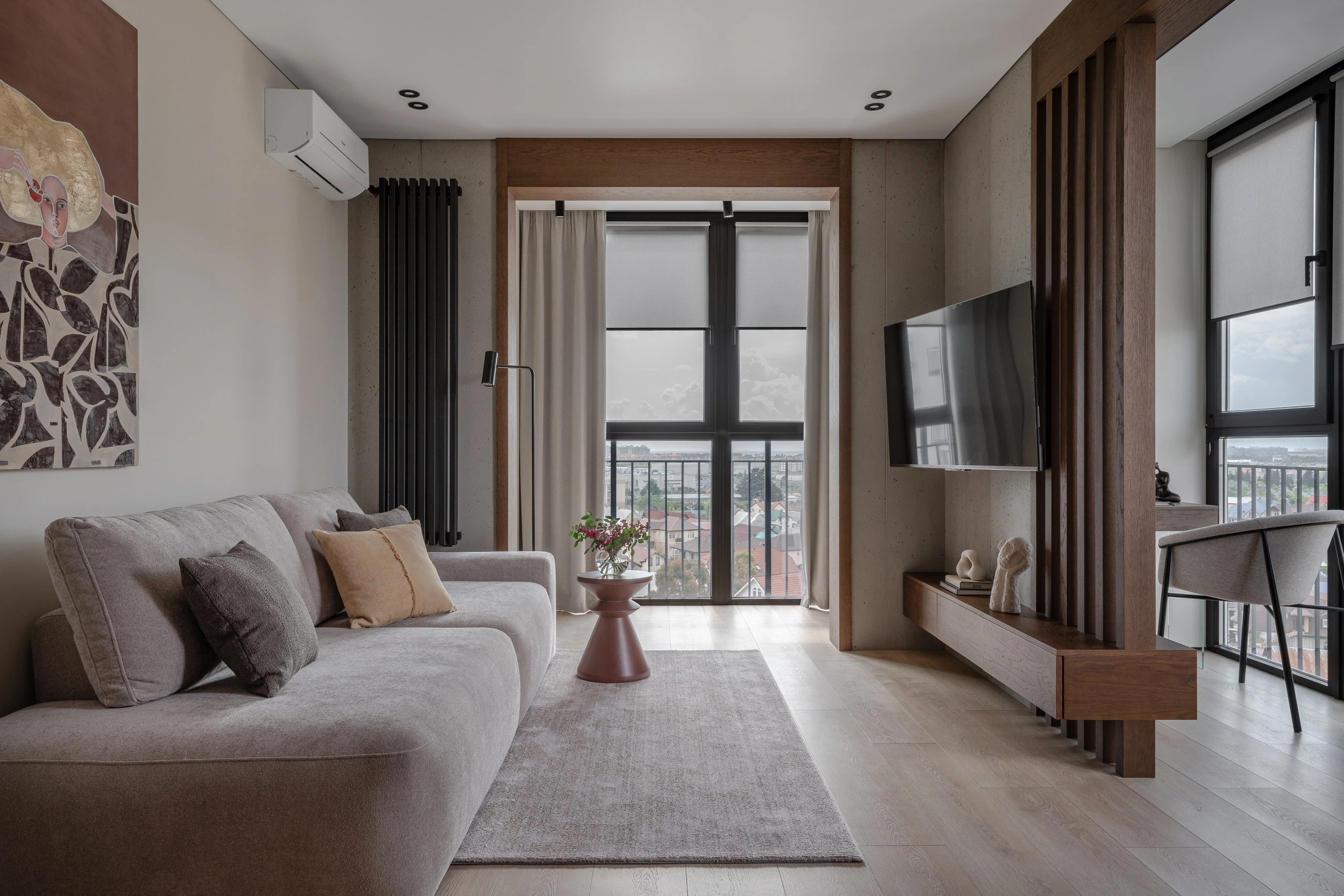 Интерьер квартиры сочетает элементы минимализма и лофта. Отличительной чертой выступает открытая бетонная стена, покрытая защитным лаком, что придаёт интерьеру особенность. Естественная фактура бетона создает контраст с окружающими предметами, делая интерьер визуально интереснее. Он ассоциируется с природными материалами, например, с камнем. Что усиливает связь интерьера с окружающей средой и природной энергетикой.