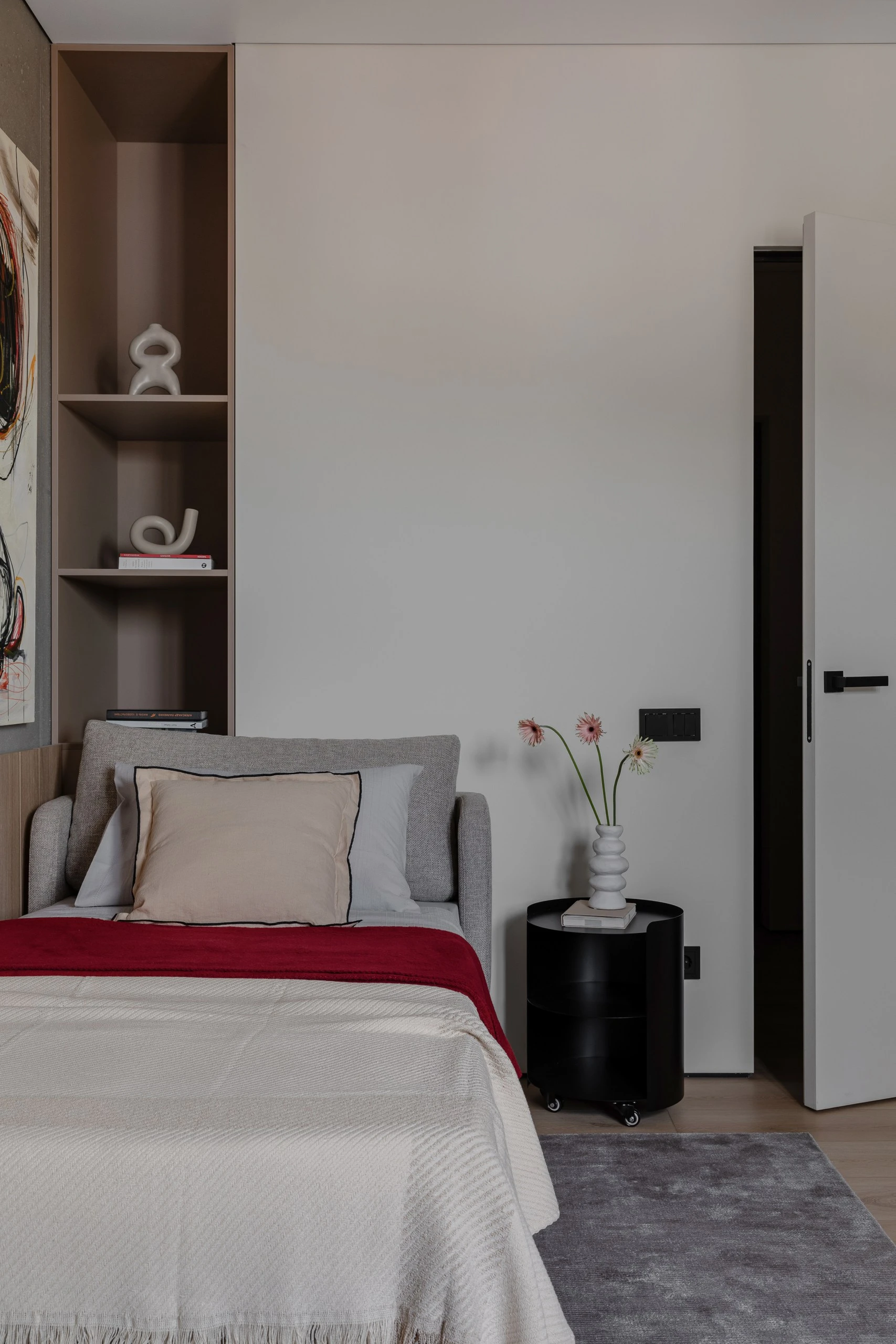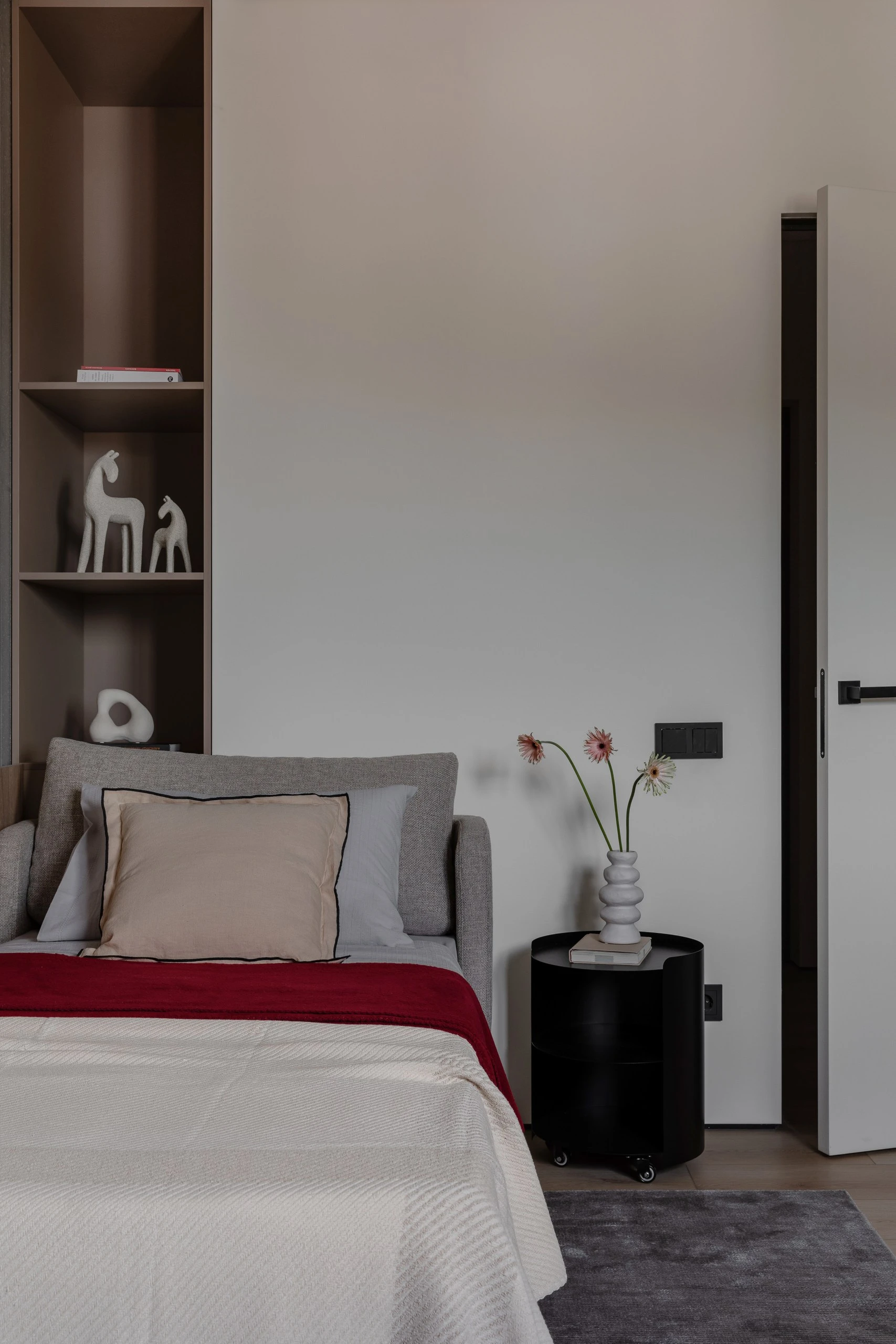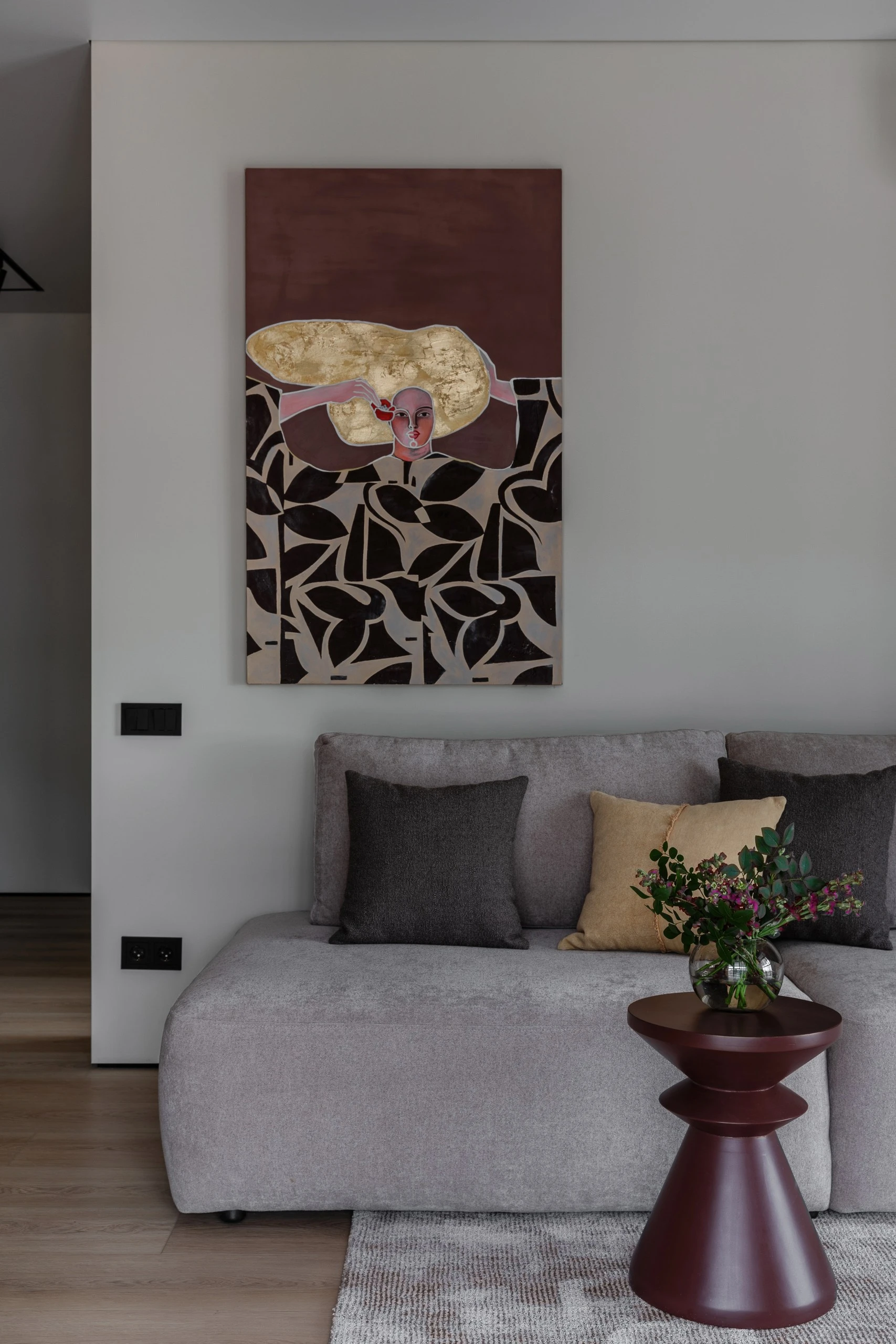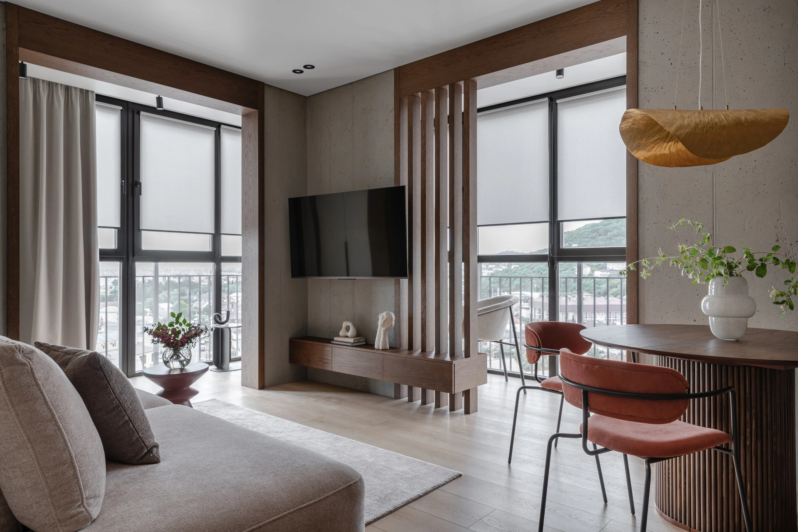Цветовая палитра интерьера состоит из нейтральных оттенков: серого, бежевого, древесного, белого. Эти естественные цвета придают интерьеру утончённость и гармонию, поддерживая целостное восприятие пространства. Погружают в спокойствие и являются «тихим» фоном для декора. А акценты в чёрном придают динамики и выразительности, также выполняя роль связующих элементов для единства интерьера.