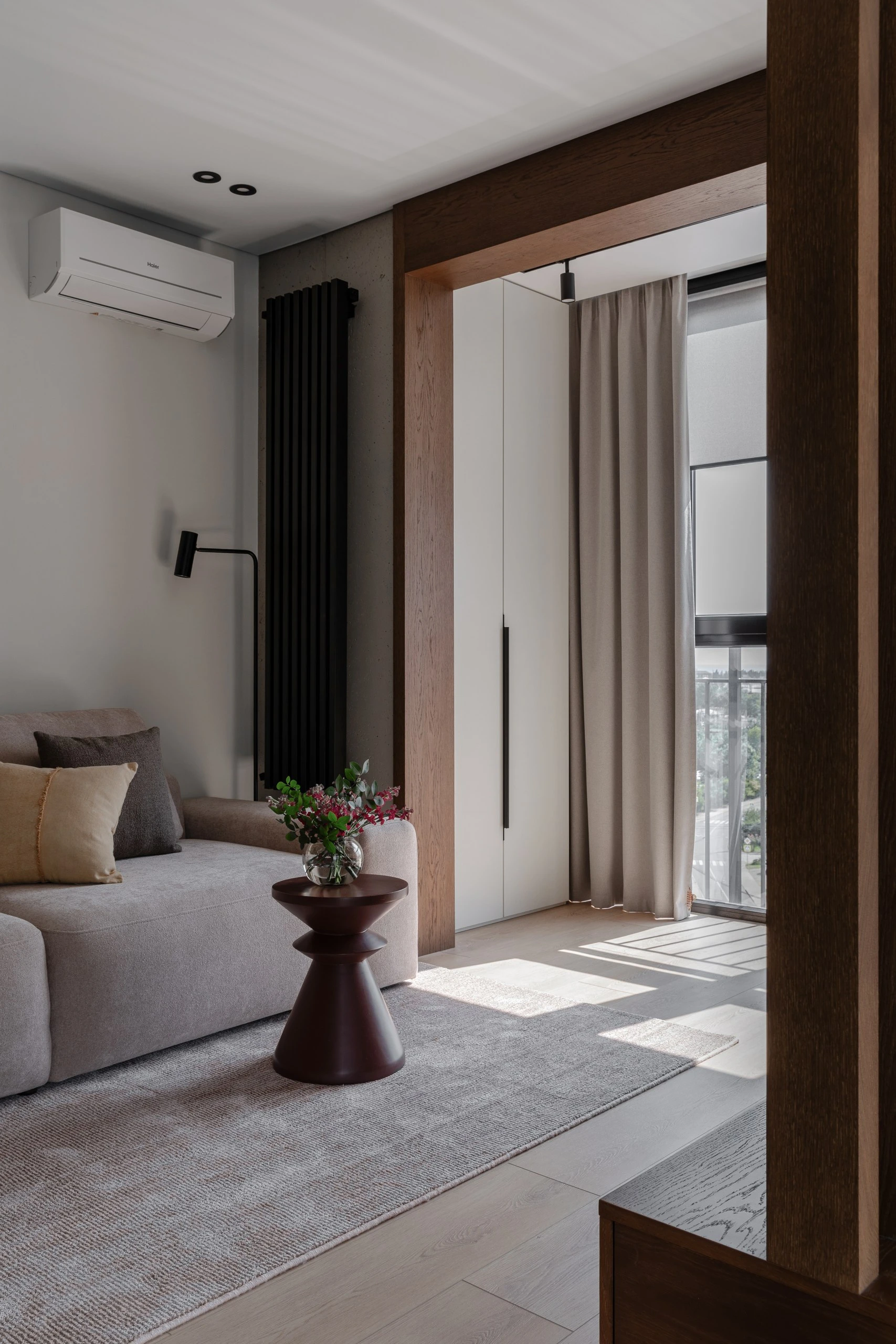 Применение вертикальных элементов: деревянных реек, радиаторов отопления, светильников — способствует зрительному увеличению высоты потолков. Контрастные линии привлекают внимание, стимулируя воспринимать пространство как более высокое и просторное.